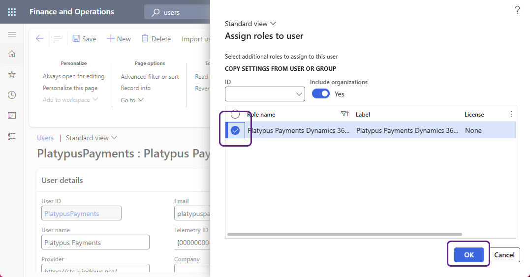 Continue with the following steps in Microsoft Dynamics 365 F&O to assign the role you previously created to the new user: